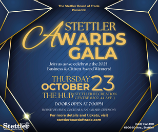 The Stettler Awards Gala has been a prestigious event for many years where we have an opportunity to honour the accomplishments of our local businesses and citizens, and this year is no exception. The 2025 Business and Citizenship Awards Gala will be held Thursday, October 23, 2025, at The HUB (Stettler Recreation Centre – 6202-44 Avenue).